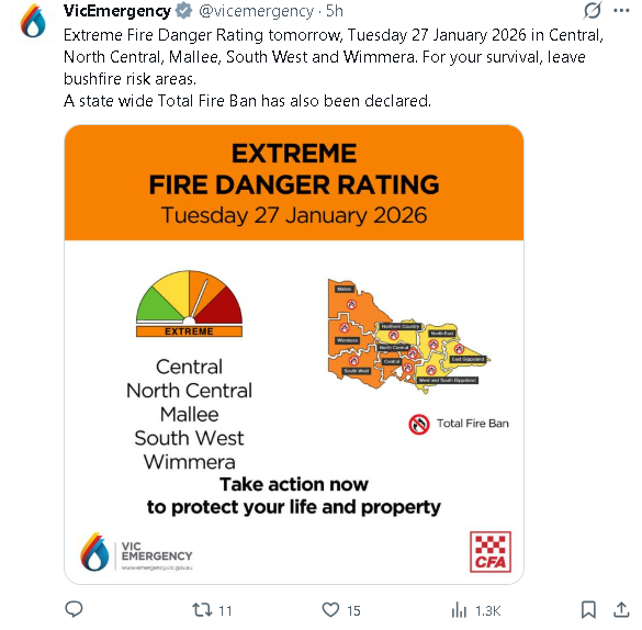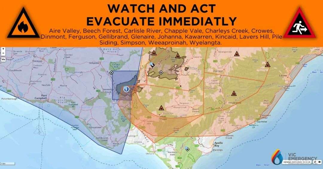 在极端高温和强风影响下,维州多地的山火危险等级已经被列为“极端”。应急部门正严阵以待,尤其是奥特威山区卡莱尔河一带正在燃烧的丛林大火,火势在这种天气条件下可能会变得非常危险、难以预测。