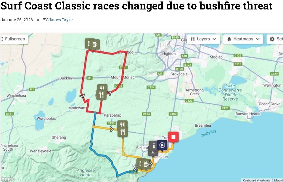 受山火影响,维州著名的公路自行车赛事Surf Coast Classic也不得不调整安排。主办方决定将原本在Lorne起跑的周三和周四比赛改为在Torquay出发,同时提前开赛时间。