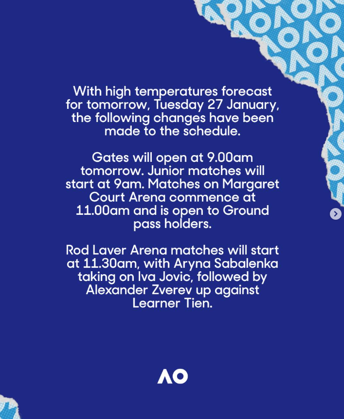 正在如火如荼进行的澳网,也官宣了周二的赛程变更: