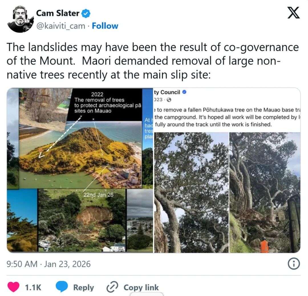 右派观点:滑坡是由于和毛利人“共同治理”政策导致的。移除山上的外来树种,是致命滑坡的重大诱因。