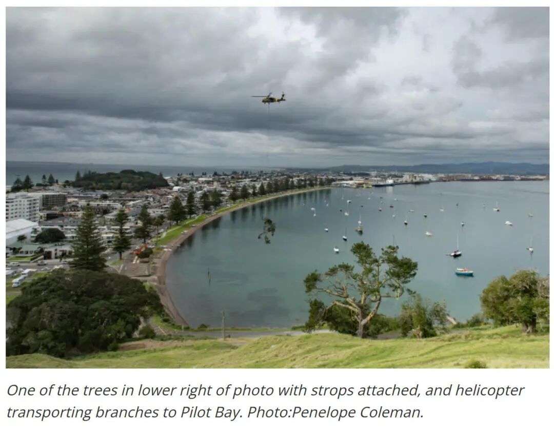 直升机吊起这些欧洲人引入的老树后,穿越陶朗加海岸的照片,也还在网上: