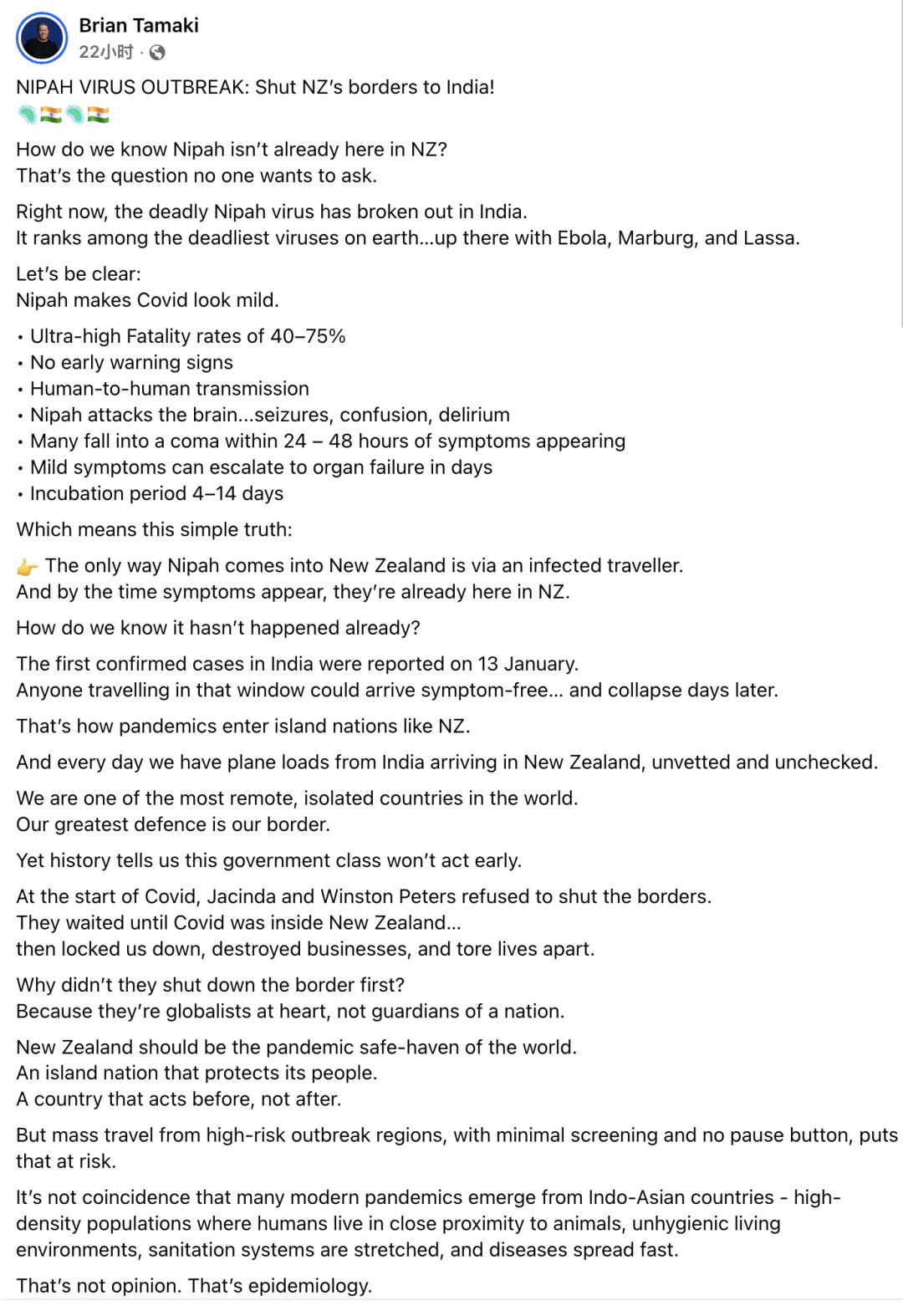 Tamaki在帖文中呼吁,当海外出现致命疫情时,新西兰应立即采取措施,包括暂时关闭边境、暂停相关国际旅行、实施有针对性的隔离政策,并表示“无需为此道歉”。