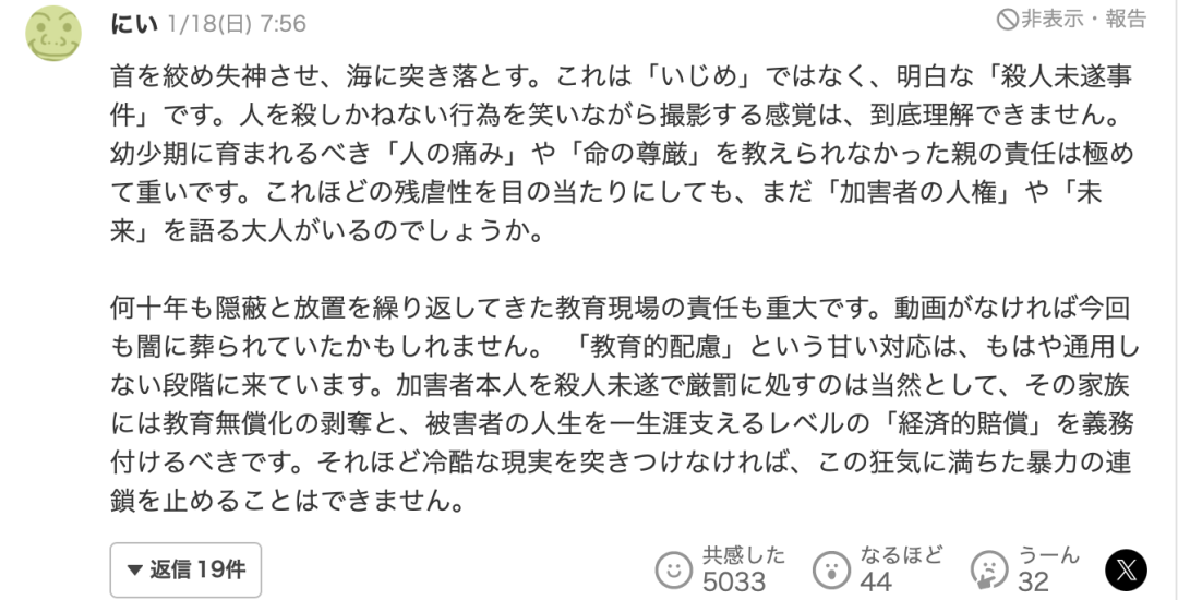 “锁喉导致对方晕倒,然后将其推进大海里,这根本不是欺凌,而是明显的谋杀未遂事件。我根本无法理解这种一边嬉笑打闹一边拍摄着极有可能导致他人死亡的行为。感觉在他们幼年时期,他们的父母并没有向他们传授尊重生命、以及共情他人痛苦的知识。目睹如此残忍的现实,我们还有必要去谈论加害者的人权以及未来吗?