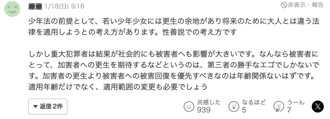 “日本少年法的前提,是为了让那些触犯法律的少年少女们能有改过自新的机会,因此才设立了与成年人法律不同的法规。这部法律的出发点是性善论,然而那些未成年重罪犯对受害者、受害者亲属以及社会的负面影响极其大。对于受害者来说,去期望施暴者能够改过自新,简直就是天方夜谭。相较于施暴者改过自新,日本法律更应优先考虑受害者的身心恢复程度。犯罪与年龄无关,少年法不仅要改变适用的年龄范围,还要改变犯罪的适用范围。”