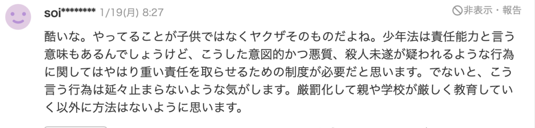 “好可怕啊!感觉犯罪的并不是未成年人,而是黑道。像这种故意、恶性、疑似谋杀未遂的行为,根本就不适用于少年法。我认为应该要判以重罪,否则这种行为是不会停止的。除了严惩,家长和学校都应该严格看管。”