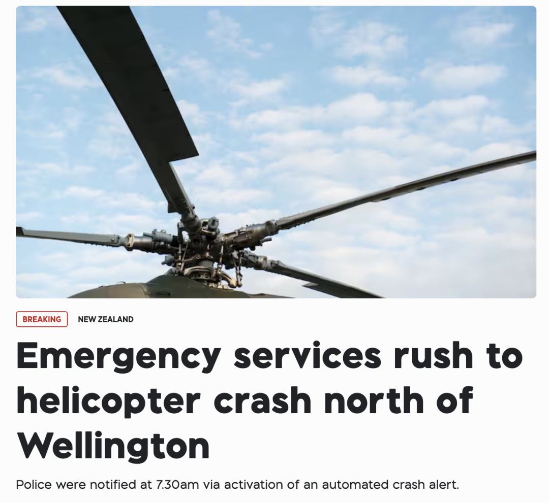 紧急突发!一架直升机在惠灵顿北部发生坠毁,目前紧急搜寻救援中。