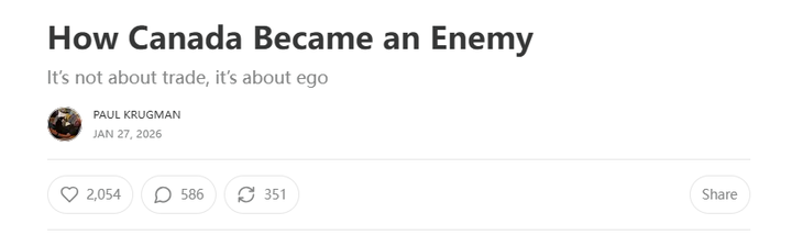 克鲁格曼认为加拿大与中国大陆敲定贸易协议,可借此降低对美国依赖,这是特朗普不愿见到的。