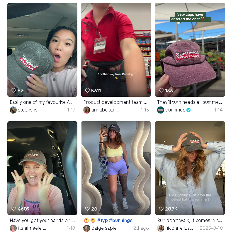澳洲最大五金连锁Bunnings,最早是为了庆祝和9频道装修节目《The Block》的合作,推出了一款自家品牌的棒球帽。