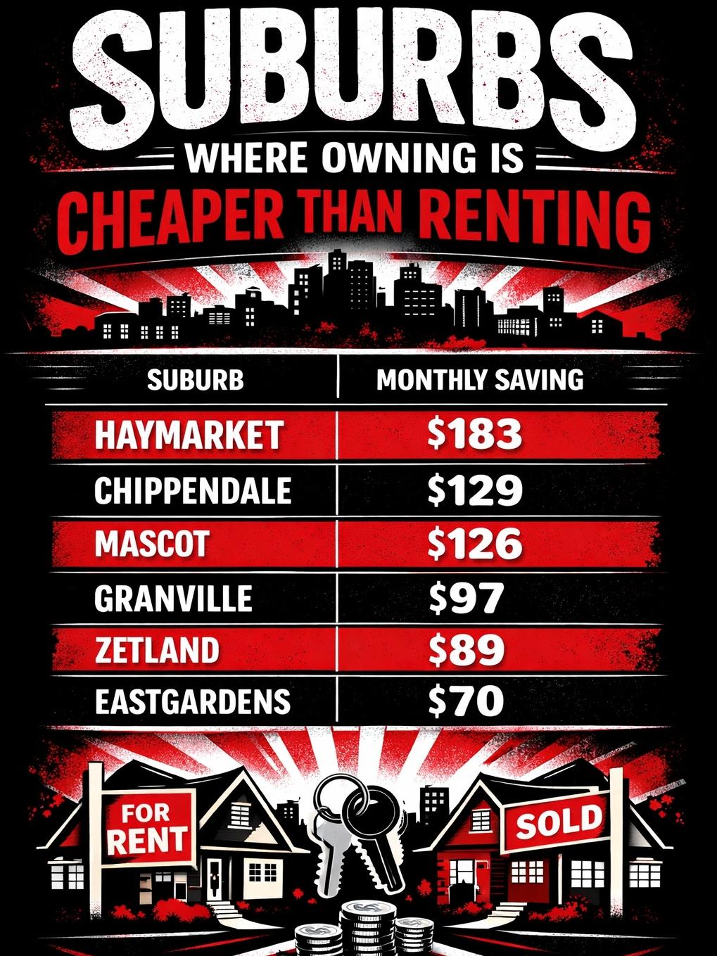 最新分析显示,在悉尼多个城区,由于租金再次飙升,偿还房贷如今比租房更便宜。