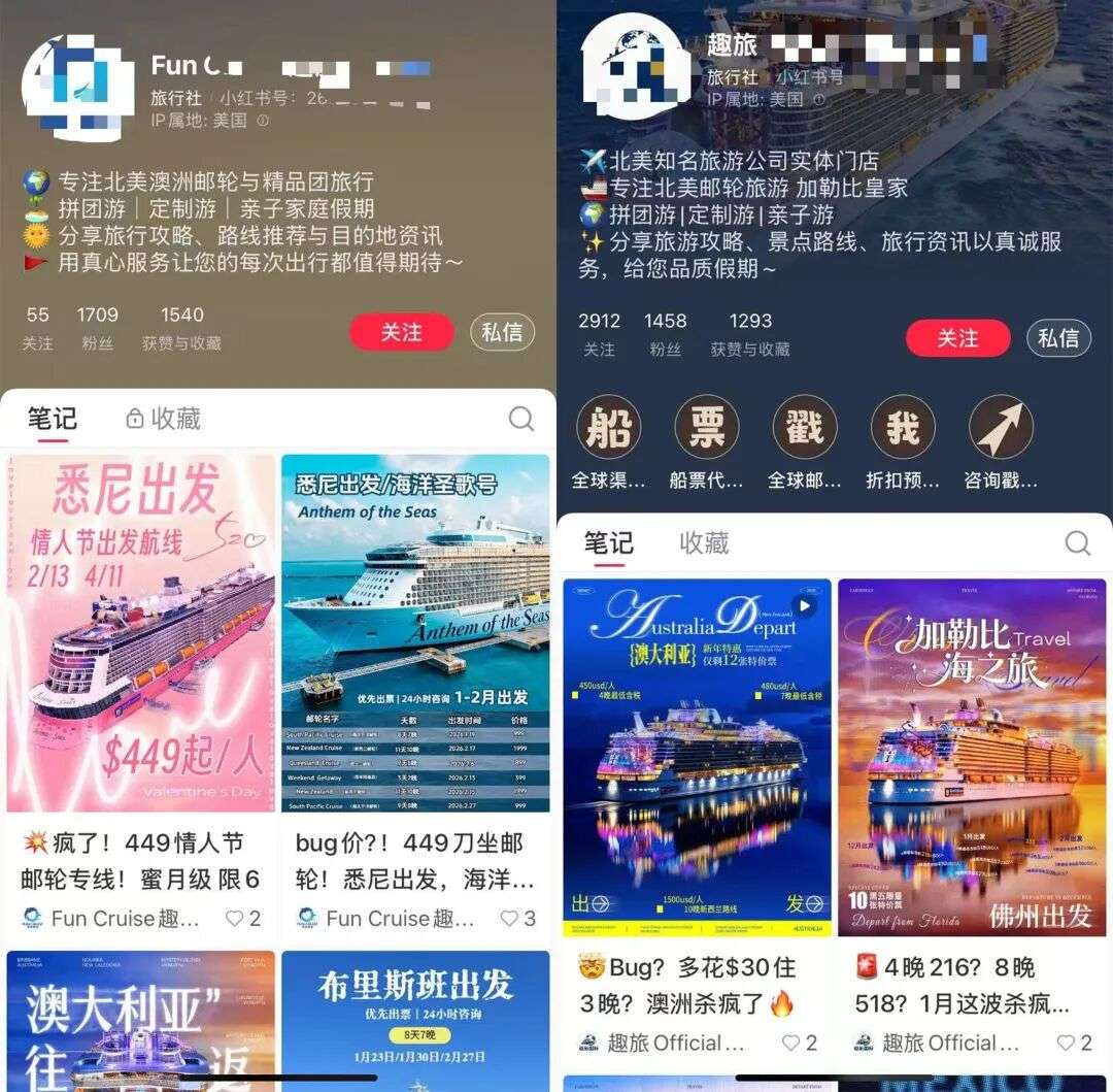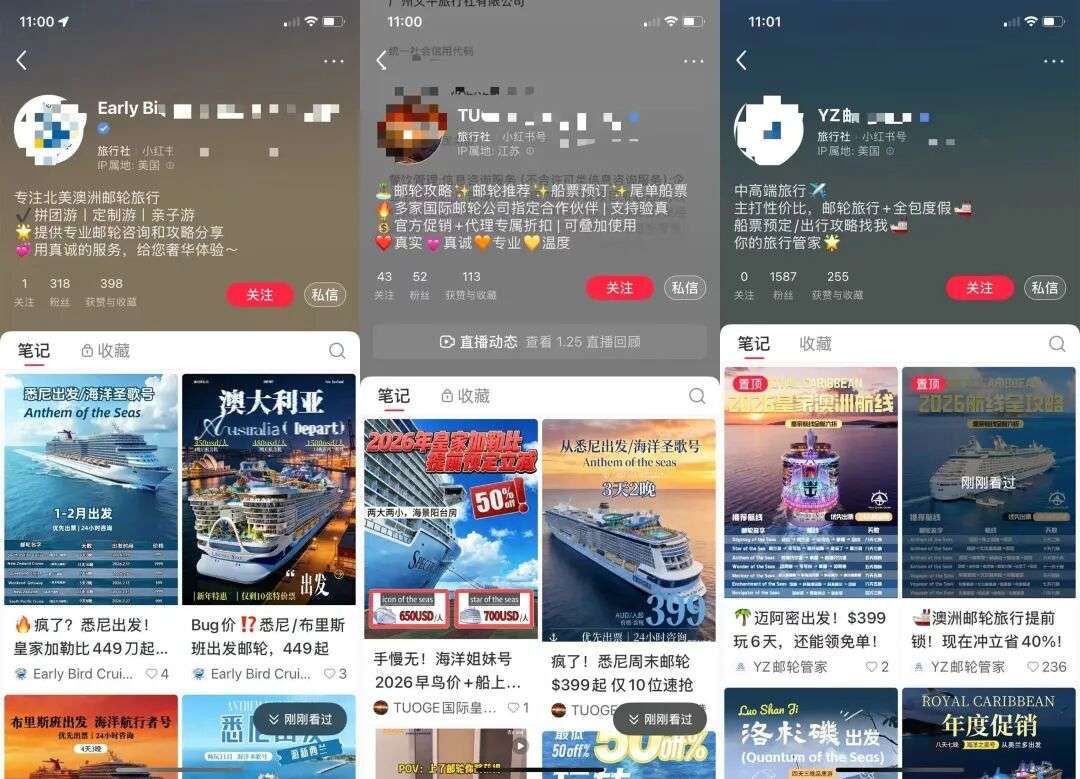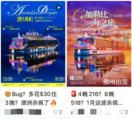 一大批打着“邮轮旅行”“官方合作”“蓝V认证旅行社”旗号的账号,疯狂在小红书投放广告,主打一个关键词:便宜!