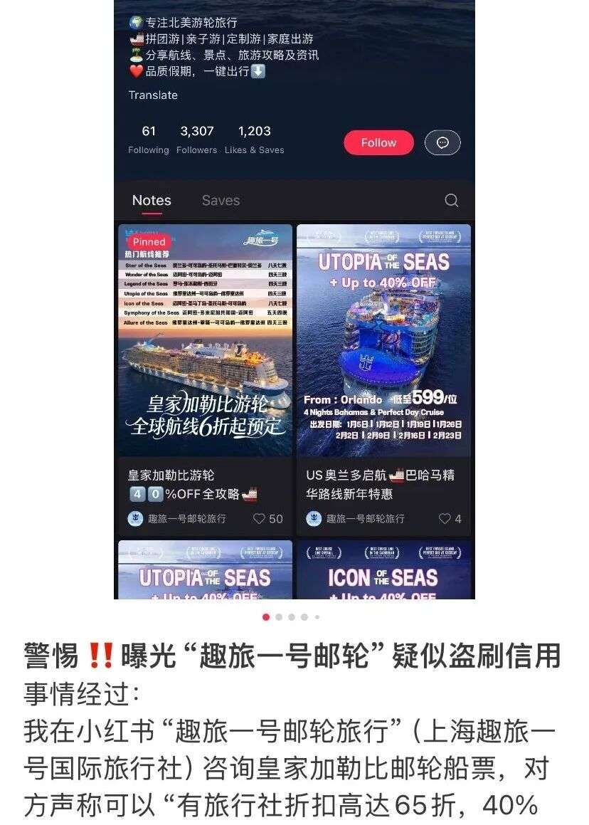 “我在小红书‘趣旅一号邮轮旅行’(上海趣旅一号国际旅行社)咨询皇家加勒比邮轮船票,对方声称可以‘有旅行社折扣高达65折,40%定金锁定舱位,登船后再付尾款’,并承诺是‘官方合作渠道’。”