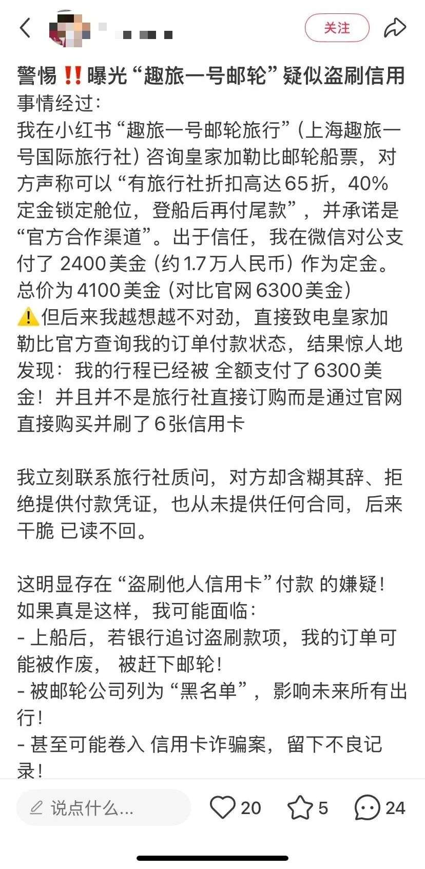 小红书上已经有人直接发帖预警,标题就是:警惕!!曝光“趣旅一号邮轮”疑似盗刷信用卡