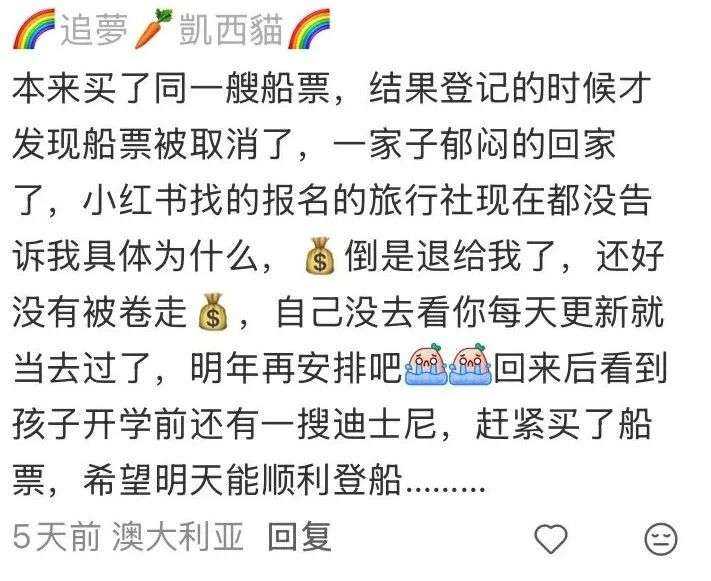 “本来买了同一艘船票,结果登记的时候才发现船票被取消了,一家子郁闷的回家了,小红书找的报名的旅行社现在都没告诉我具体为什么,倒是退给我了,还好没有被卷走钱。”