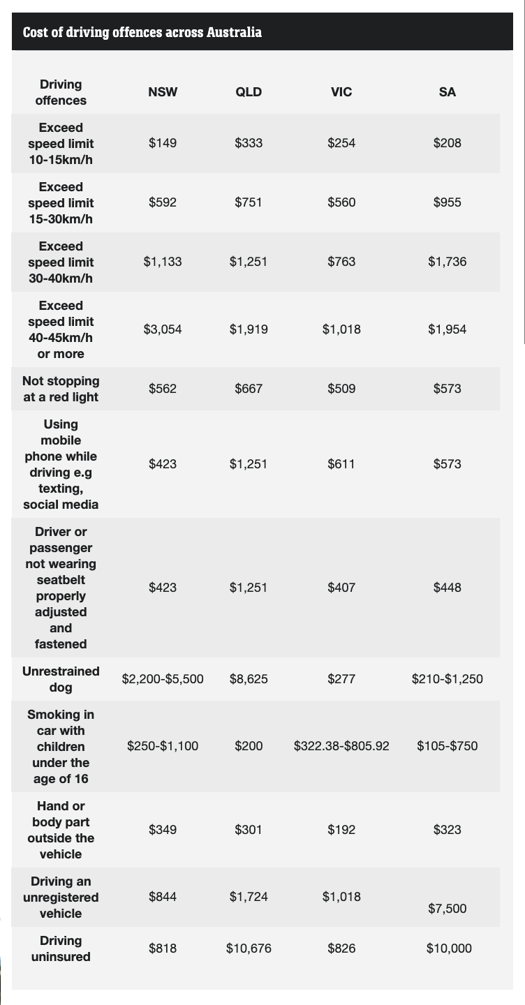 其他州和领地的处罚也各有特点:南澳对超速或不系安全带等违规行为罚款均高达数百刀至上千刀;澳洲首都领地(ACT) 对手机驾驶罚款约 $674 澳元 + 4 分罚点;塔斯马尼亚 对无保险驾驶罚款约 $3,440 澳元;西澳对无保险驾驶罚款约 $8,000 澳元。与此同时,即使是看似小错如红灯、闯线或未正确带安全带,处罚也可能超过数百刀以上。