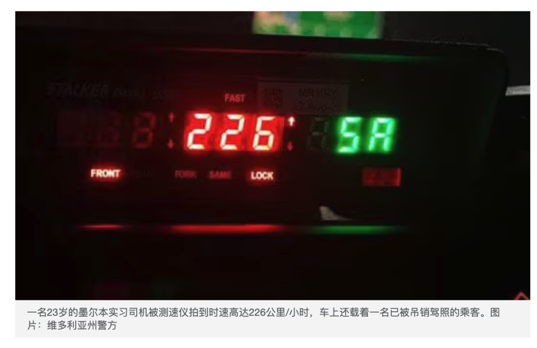 维多利亚州的驾驶员如果严重超速,将面临严厉的处罚,超速 25 公里/小时以上将被处以最高 1018 澳元的罚款,并可能被吊销驾照长达一年。