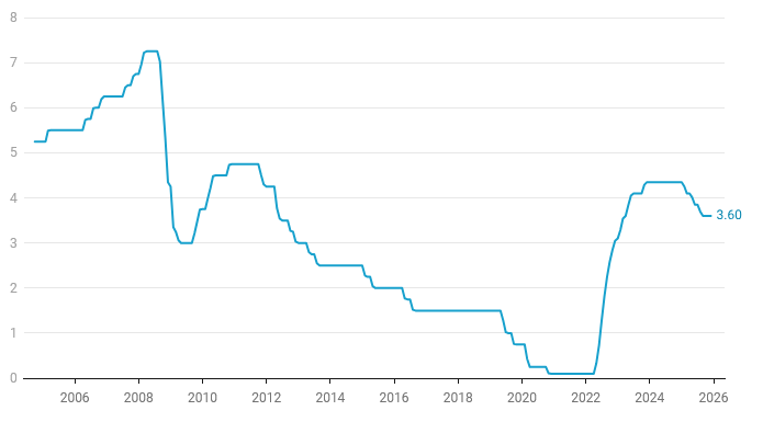 目前的利率在去年多次下调后维持在3.6%。