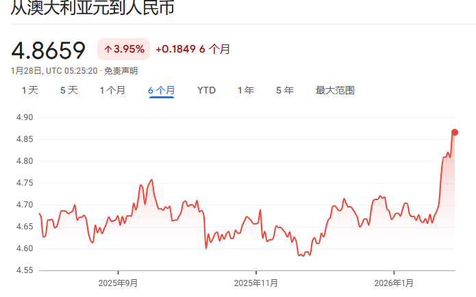 从1月中旬开始,澳元兑人民币的汇率就从此前的4.7不到,飙升至如今的4.87。