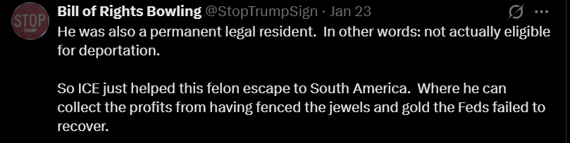 他还是永久合法居民。换句话说,他根本不该被遣返。所以ICE是不是亲手把一个重罪犯送回南美,让他去享受那些没被追回的赃款?