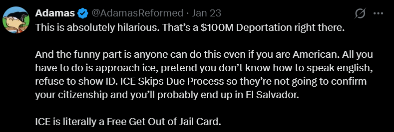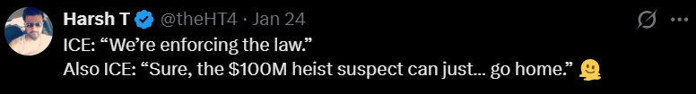 还是 ICE:“行吧,那位卷走 1 亿美元的劫案嫌疑人……就先回家吧。” ????
