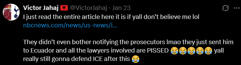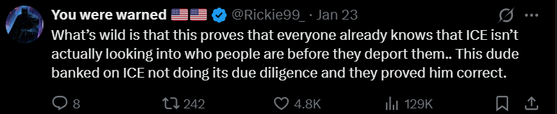 最离谱的是,这件事反而证明了一点:大家心里其实早就知道,ICE 在遣返人之前,根本没认真核实身份。这哥们就是赌了一把 ICE 不会尽职调查,结果事实证明他赌对了。