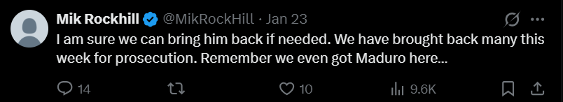 我很确定,如果需要,我们完全可以把他再弄回来。这周已经把不少人带回来接受起诉了。别忘了,连马杜罗我们都能搞到这儿来……