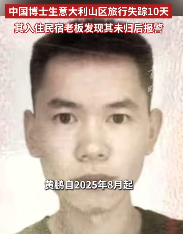 据意大利媒体报道,黄鹏是四川大学的博士生,自2025年8月到意大利图西亚大学进行访学。他被描述为文静内敛,身材纤细,身高约170厘米,说普通话时有中国西南口音。