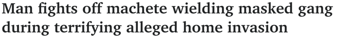 一对情侣在 Surrey Downs 遭遇疑似入室抢劫后,至今仍心有余悸。周二凌晨约1点,6名戴着面罩、持刀具的歹徒踹开 Zuleika Street 一处住宅大门闯入。屋主 Joel Shaw 与女友 Matilda White 当时在家,Mr Shaw 独自面对“六对一”的暴力攻击。歹徒向他投掷家具和铝罐,逼他交出车钥匙和财物,并威胁若报警将返回杀人。