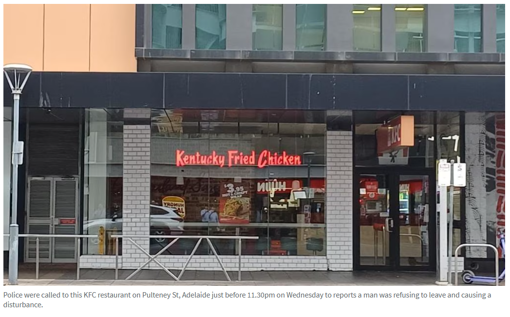 据报道,周三晚间近11时30分,南澳警方接报称一名男子在Pulteney St一家KFC快餐店拒不离店并引发骚乱。据警方通报,该男子翻越柜台袭击了三名餐厅员工。