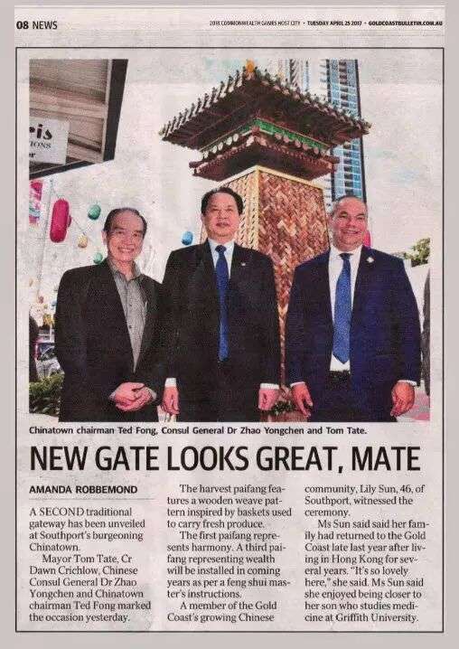 他的梦想终于在20多年后实现——在昆州政府支持下,他以黄金海岸唐人街协会主席身份,2014年协助唐人街在 Southport 落成。