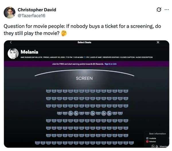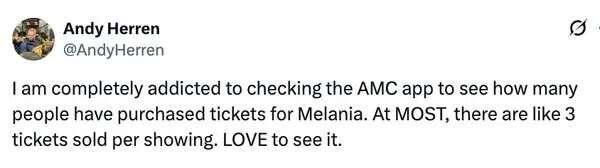 我已经彻底上头了,天天刷AMC的App,就想看看《梅拉尼娅》到底卖了几张票。结果每一场最多也就卖了三张。说真的太爱看这种场面了。