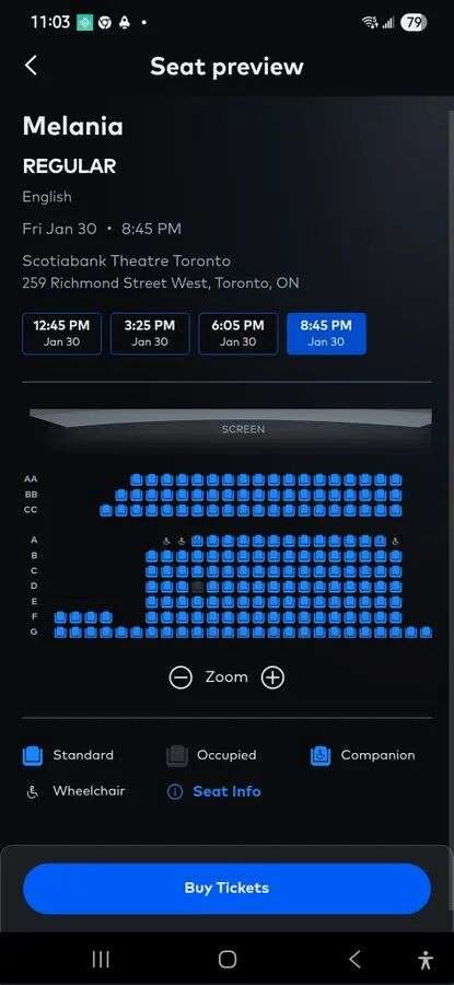 纽约情况稍微“好”一点,但也只是“稍微”:林肯中心AMC,周五 6:45:122个座位,卖出45个(约36%);