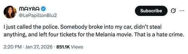 我刚报警了。有人撬了我的车,什么都没偷,只留下了四张《梅拉尼娅》电影票。这已经算是仇恨犯罪了。