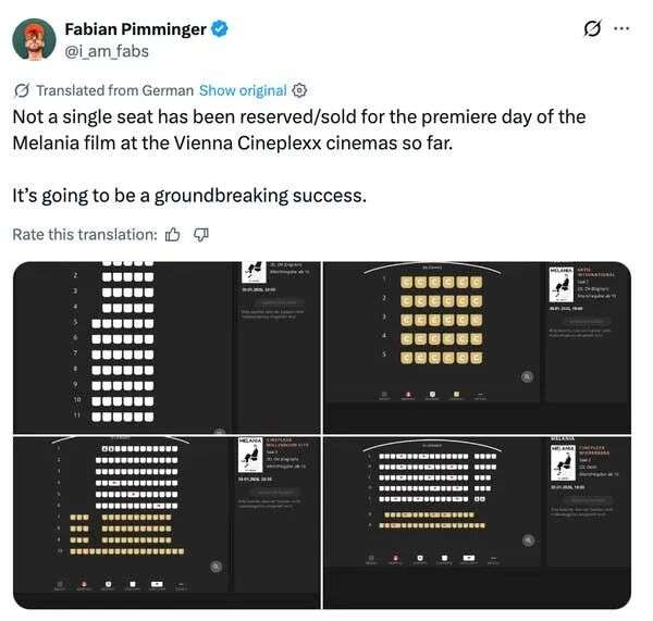 维也纳的网友现场快讯:截至目前,维也纳Cineplexx影院里,《梅拉尼娅》电影首映当天一张票都没卖出去,连一个座位都没人订。注定会是一次“划时代的巨大成功”。