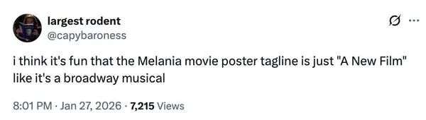 我觉得还挺好笑的,《梅拉尼娅》电影海报上的宣传语居然就写了个“A New Film(一部新电影)”,搞得跟百老汇音乐剧官宣一样。