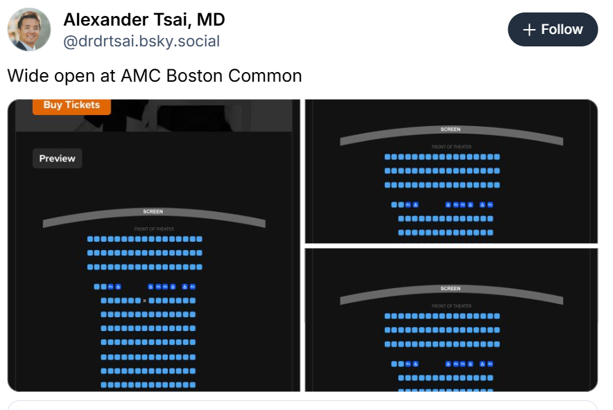 波士顿最大AMC影院:周五晚三场放映,只卖出1张票