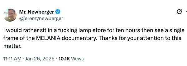 我宁可在一家该死的灯具店里干坐十个小时,也不想看《梅拉尼娅》纪录片里的哪怕一帧画面。