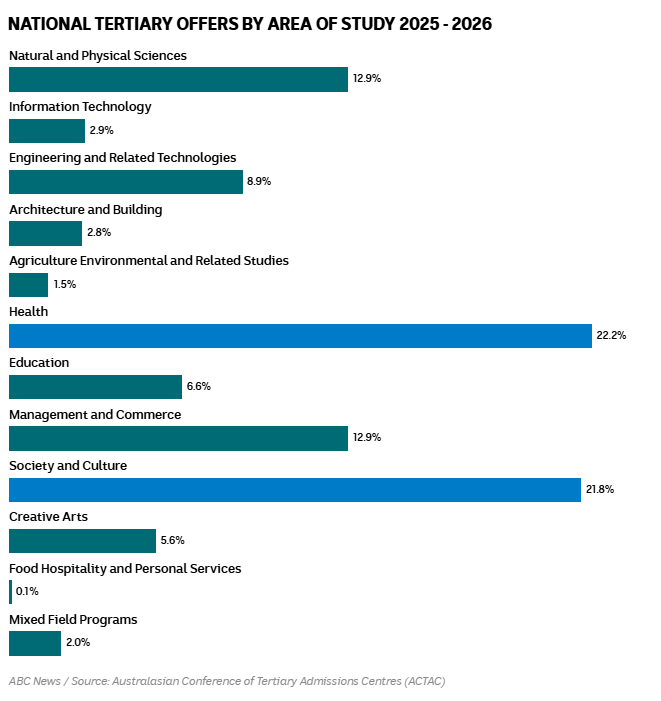 根据Australasian Conference of Tertiary Admissions Centres(ACTAC)汇总的各州大学录取中心数据,截至目前,健康类课程占今年本科录取通知书的22%以上,连续多年位居第一。
