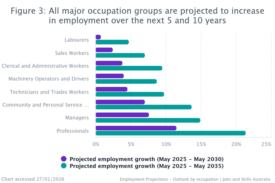 在更宏观的层面,Jobs and Skills Australia(JSA)发布的数据显示,未来十年医疗与社会援助行业的就业预计增长28%,IT相关职业也将增长25%。