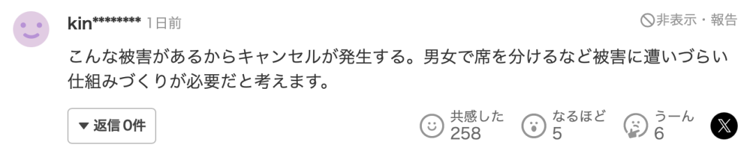 “正是会发生这种事情,所以会频频发生临时取消座位的事情。我认为当下非常有必要设立男女座位专区,这样能保护彼此不受伤害。”