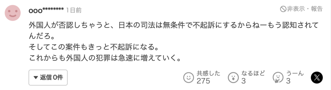 “如果外国人否认指控的话,日本司法估计是不会起诉的吧。感觉这已成惯常操作了,而且这个案件一定不会被起诉。今后在日本的外国人犯罪也会迅速增加。”