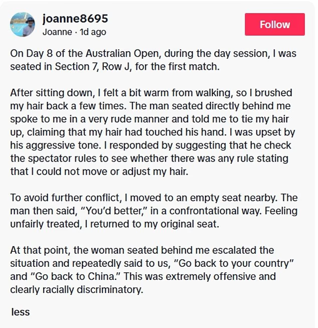 据报道,近日有网友在Tik Tok上发文,称自己在澳网赛场观赛时遭遇种族歧视。相关事件在网络上引起热议。
