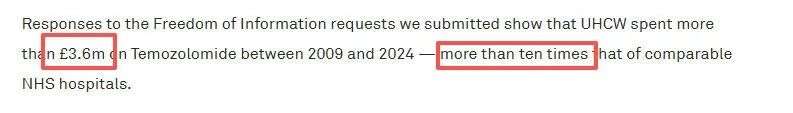 2009年~2024年间,UHCW在替莫唑胺上的支出超过了360万英镑,是同类NHS医院的10倍以上。