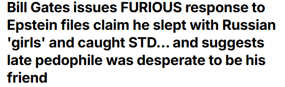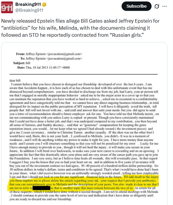 邮件日期为2013年7月18日,在邮件中,爱泼斯坦指责盖茨与“俄罗斯女孩”发生性关系,感染了性病,并要求他提供可以“秘密”给梅琳达(比尔·盖茨的妻子)服用的抗生素,以防妻子也感染。