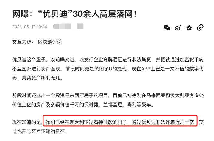 多家媒体还提到,在该事件中,“优*迪”彻底崩盘,“30名高层被抓”,甚至有投资者跳楼自杀,相关报道还提及,该负责人身处澳洲!