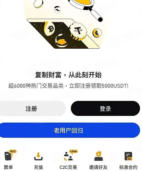 从该平台应用页面可以看到,首页醒目写着“复制财富,从此刻开始”,并自称是“安全可靠的数字资产平台”,可以将本地货币转换为BTC、ETH、USDT等数字资产,同时提供“跟单”“C2C交易”“标准合约”等多种投资渠道,看上去非常完整,也极具迷惑性!
