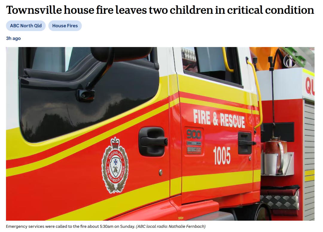 今天凌晨5点半左右,昆州北部Townsville 北郊Bushland Beach那里一栋房子发生火灾,一名幼儿和一名小学年纪的儿童伤势危重。