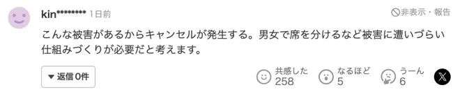 “正是会发生这种事情,所以会频频发生临时取消座位的事情。我认为当下非常有必要设立男女座位专区,这样能保护彼此不受伤害。”