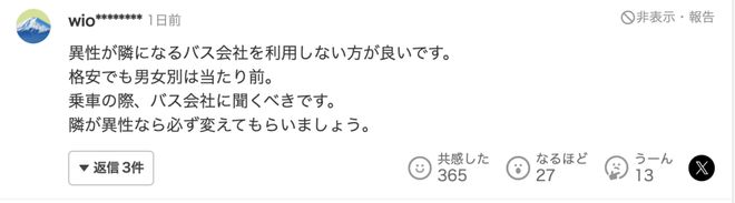 “就算价格再便宜,最好也不要选择那些邻座是异性的夜间巴士,毕竟男女分开而坐是理所当然的事情。在上车之前,最好问问巴士公司。如果邻座是异性的话,一定要及时更换座位。”
