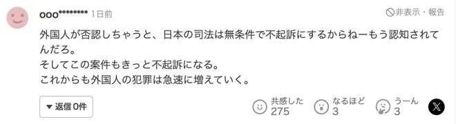 “如果外国人否认指控的话,日本司法估计是不会起诉的吧。感觉这已成惯常操作了,而且这个案件一定不会被起诉。今后在日本的外国人犯罪也会迅速增加。”