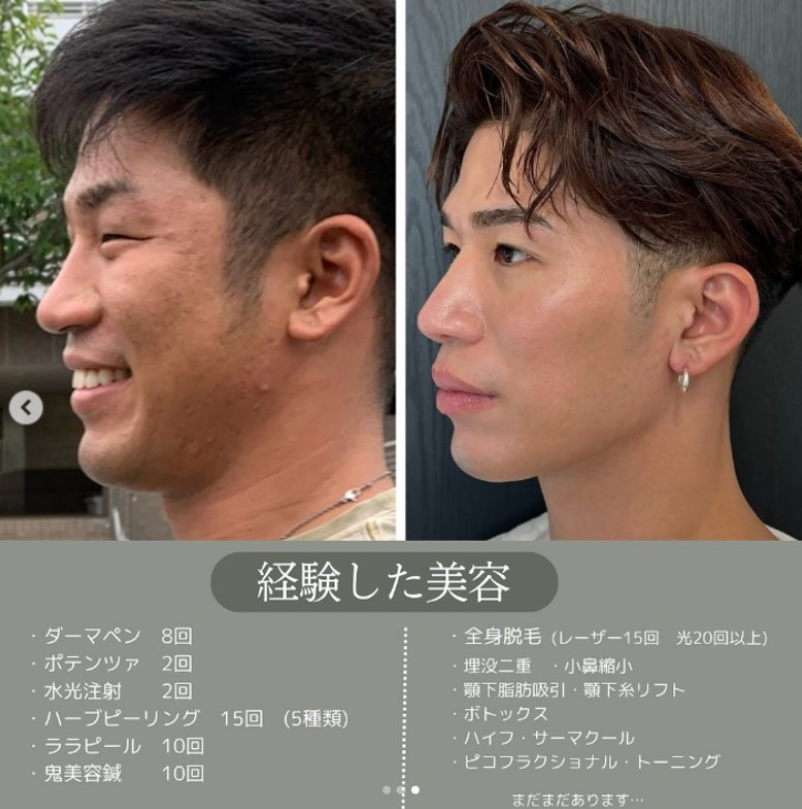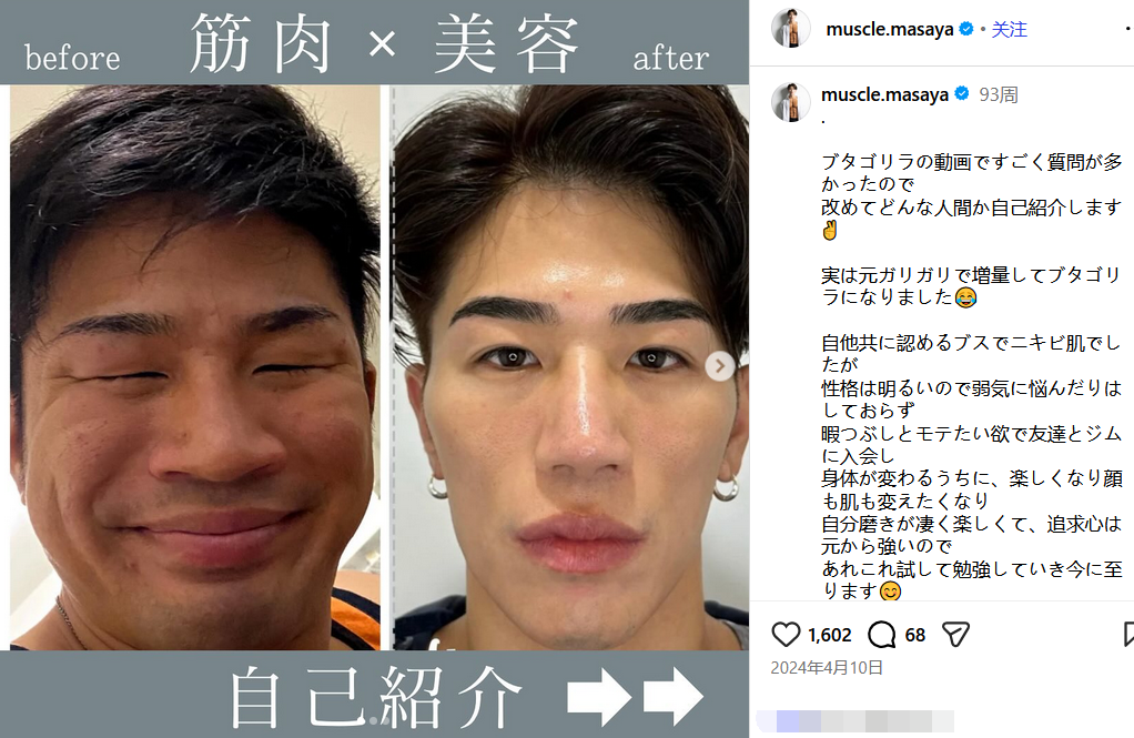 まっするまさや的整形之路,并非一时兴起。最初他只是做了眼部整形,配合着坚持已久的健身,让他慢慢开始收获旁人的好感,真正让他桃花运 “井喷” 的,还是那台90万日元的隆鼻手术。